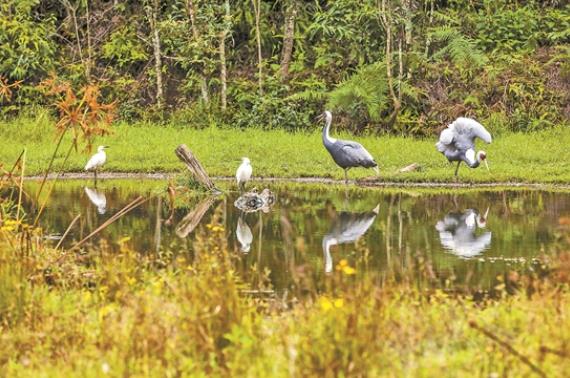 行至茭瓜塘湿地,动物观察员鲁梅正在给湿地里的鸟类喂食。“你看那只白一些的是白枕鹤,灰色羽毛的是灰鹤,还有一只是国家一级保护动物东方白鹳。”鲁梅对湿地的动物了如指掌。她告诉记者,这片湿地因附近居民曾经在这里大量种植茭瓜而得名。随着对森林生态保护力度的加大,村民逐渐退出这片传统活动区域,现在这里野花野草肆意生长,白枕鹤、灰鹤悠然漫步。在太阳河国家森林公园,这样人与自然和谐相处的画面随处可见。