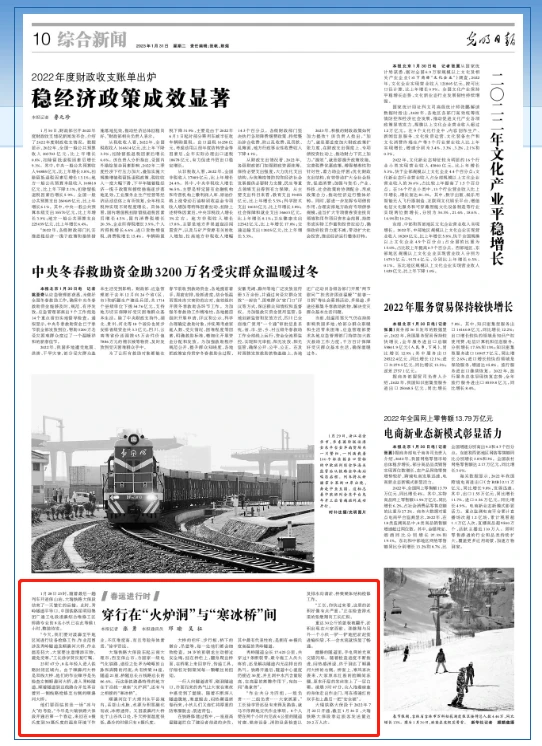 1月31日《光明日报》“春运进行时”栏目刊发文章报道云南8名维修人员在0摄氏度到30摄氏度的温差环境下作业为大瑞铁路大保段首个春运护航