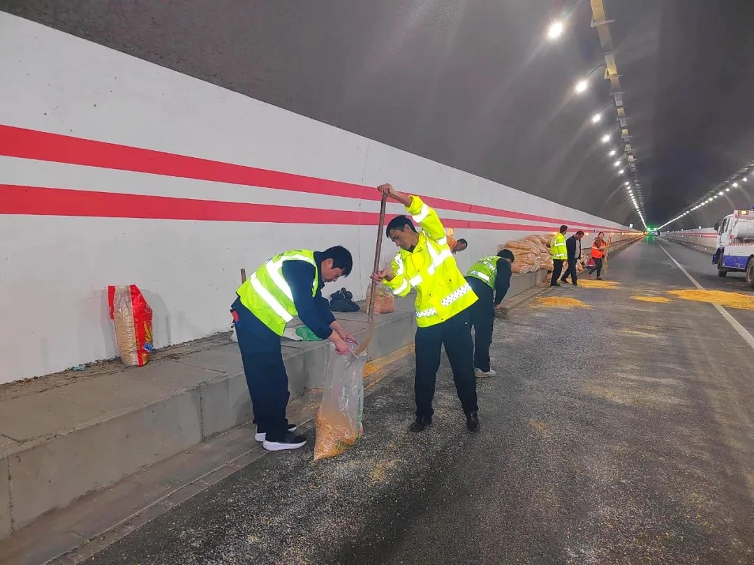 隧管员迅速出动,奔赴现场救援。到达现场后,大家训练有素、分工协作,摆放警示标志、进行交通管制、疏导车辆,对路面进行清扫。当日20时15分处置完毕,交通恢复正常,事故未造成人员伤亡。