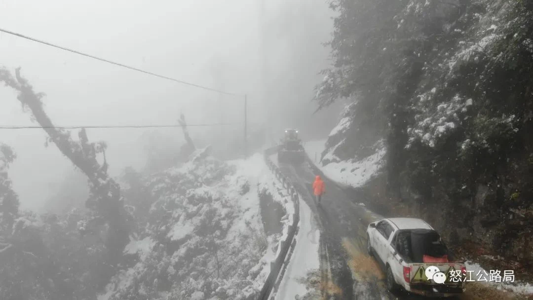 受西北气流影响,2月8日凌晨开始,贡山县境内高海拔地区发生雨雪天气,怒江公路局贡山公路分局管养的S318线云岭-独龙江公路K147+000~K156+880(独龙江公路隧道入口)、K163+560(独龙江公路隧道出口)~K176+000路段出现路面积雪结冰,过往车辆通行不畅。