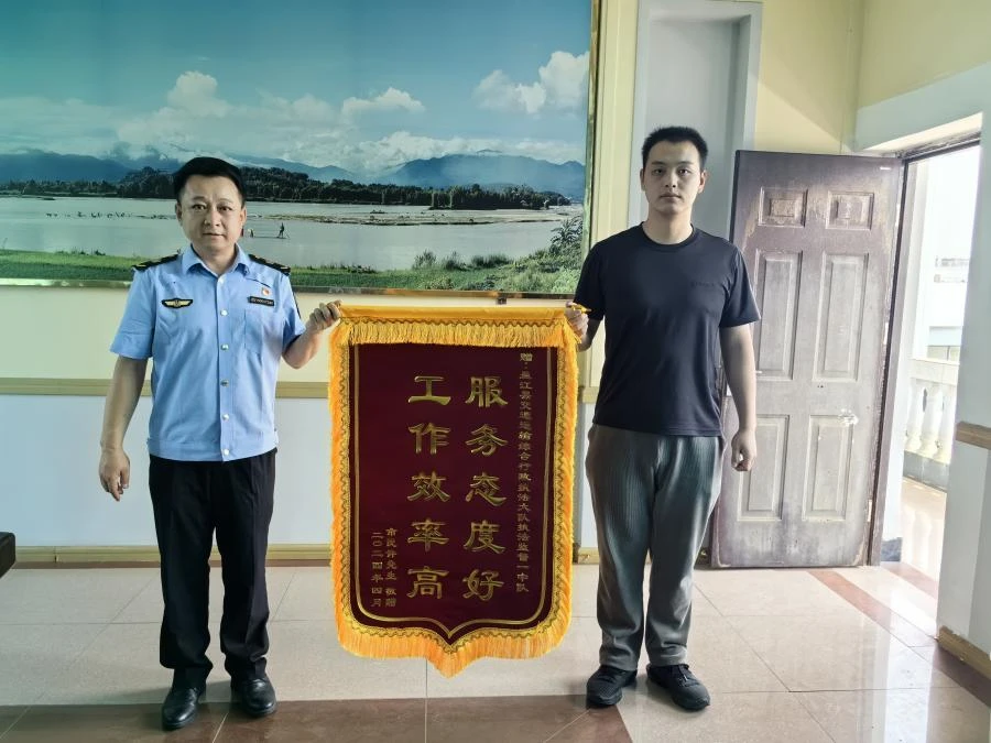 2024年4月15日,德宏州交通运输综合行政执法支队盈江大队像往常一样忙碌着。乘客许先生手持一面绣着“服务态度好、工作效率高”的锦旗,来到一中队办公室对执法人员表示谢意。