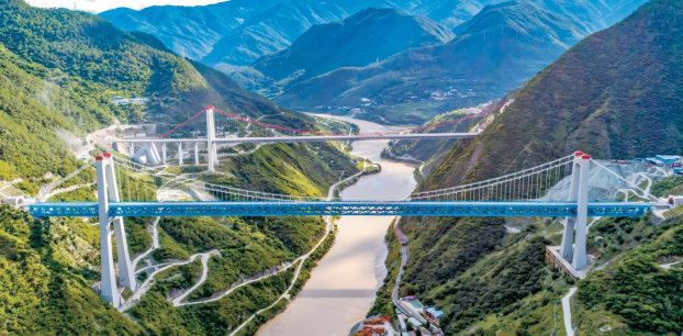 丽香铁路金沙江大桥与远处的香丽高速公路虎跳峡金沙江特大桥“双桥同畅”。陈欣波/摄