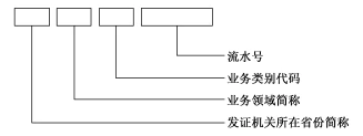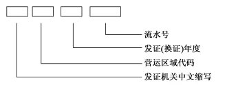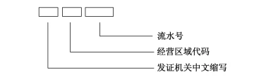 流水号由五位阿拉伯数字组成,即“发证机关区域编号(00-16)+流水号(001-999)”其中,“发证机关区域编号”按编号表执行,“流水号”由发证机关按照经营区域顺序编号。