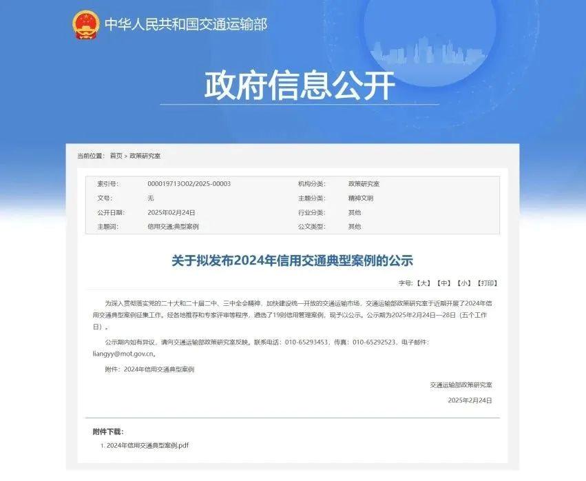 近日,交通运输部网站发布信息,就2024年信用交通典型案例进行公示。经各地推荐和专家评审等程序,遴选了19则信用管理案例进行公示。