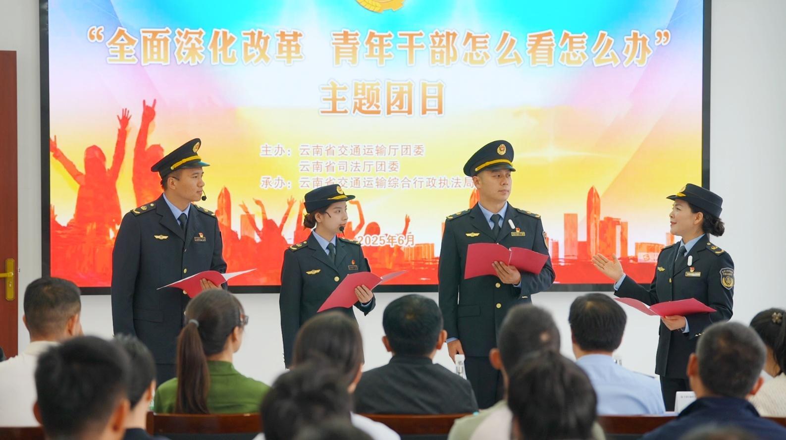 6月24日,省交通运输厅团委联合省司法厅团委在省交通执法局一线执法站所开展“全面深化改革 青年干部怎么看怎么办”联合主题团日活动。省司法厅团委、省交通运输厅及厅属各单位团委、中铁建昆仑集团运营公司云南指挥部青年共50余人参加活动。