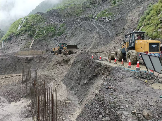 (上图)持续强降雨在怒江美丽公路丙中洛至贡山段引发4次泥石流,导致交通中断。集团组织力量全力抢险,安排专人实施交通疏导与管制,于6月27日第四次抢通半幅道路。