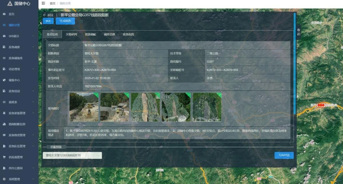 “智慧公路应急辅助指挥平台”具备实时影像传输、数据运算、抢险规划、卫星定位等核心功能,收录云南省公路局下属国储中心、16个公路局及126个公路分局应急中心的地理位置,以及应急人员和机械设备等基本信息,实现“省级—州市级—县区级”三级联动。借助地理信息系统,平台能够实时调配应急资源,保证人员、设备、物资高效到位,同时记录、分析与总结抢险全过程,形成数字化的“应急过程总结归档”,为后续应急工作提供经验参考。
