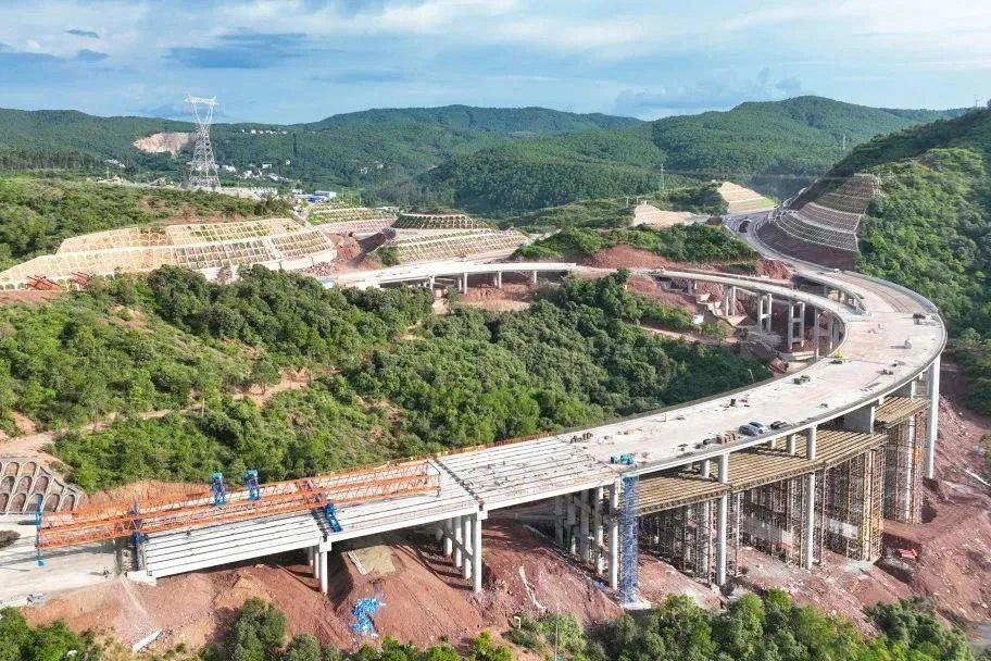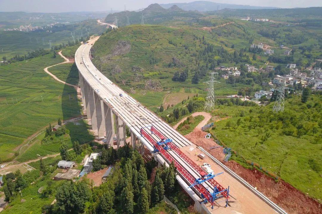 8月5日,楚雄市东南绕城高速公路项目2-2工区楚雄南互通A匝道桥完成全部预制T梁架设任务。