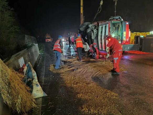 11月19日23时46分,夜色正浓,G213策磨线会泽段K3128+300路段突发紧急情况,一辆大货车行驶中不慎侧翻,车上货物散落路面,油箱破损,燃油泄漏,污染面积达150平方米。泄漏的柴油在夜间低温环境下极易结冰打滑,不仅造成道路双向交通中断,更给过往车辆和行人带来极大安全隐患,对周边道路环境构成威胁。