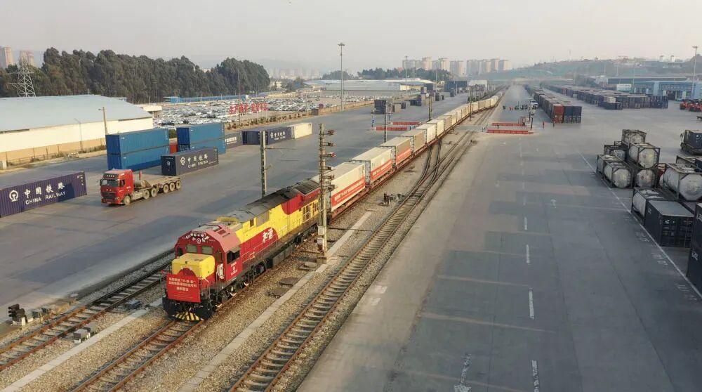 中老铁路国际货物列车从中铁联集昆明中心站驶出。图源:新华社