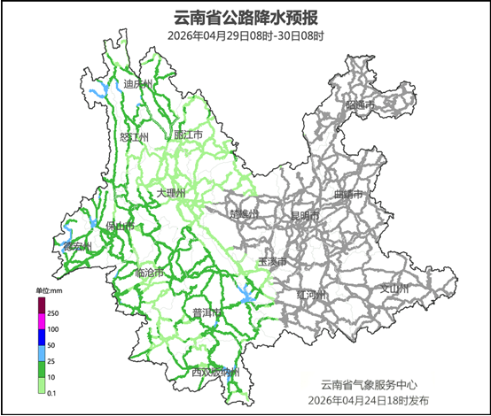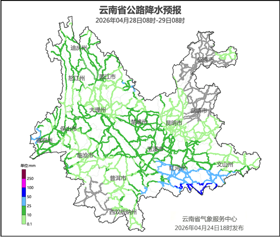 云南省气象台4月24日18时发布重要天气预报:受低涡切变和冷空气共同影响,预计4月27日至29日,我省大部分将出现降温降雨天气过程。中北部最高气温将下降4—6℃,局部地区超过8℃;全省大部分将自东向西出现中雨局部大雨、暴雨,其中,昭通市、曲靖市北部和南部、昆明市南部、楚雄州北部、玉溪市北部和西南部、文山州西南部、红河州南部、普洱市东部、西双版纳州东部、临沧市中西部、保山市、德宏州、怒江州、迪庆州、丽江市北部和东南部过程累计雨量30—60毫米,德宏州西部局部地区80—120毫米。伴随降雨还将出现雷电和局部地区短时强降水、大风、冰雹等强对流天气。请公众注意出行安全和防寒保暖。
