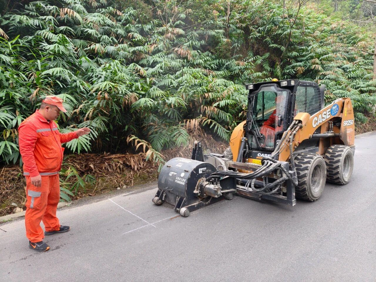在S209线K697+150处,陆德林指挥钟红伟驾驶小型铣刨机处治病害